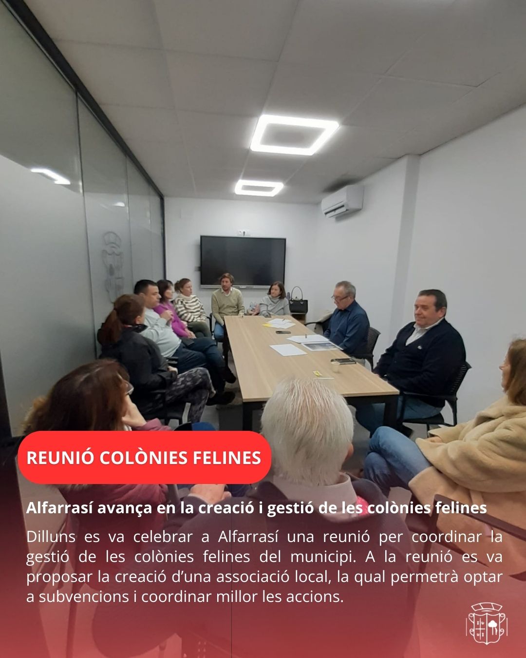 Ahir es va celebrar a Alfarrasí una reunió per coordinar la gestió de les colònies felines del municipi. L’alcalde, Ismael Sanvíctor, va explicar que els gats són competència municipal i va proposar la creació d’una associació local, la qual permetrà optar a subvencions i coordinar millor les accions.